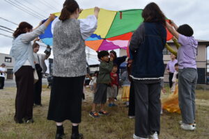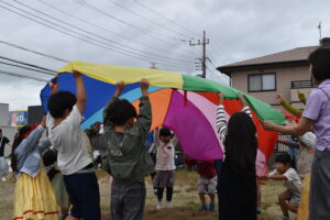 大きなカラフルなパラシュートを使った遊びでは、子どもたちが先生たちと協力し、英語の指示を聞きながら中に入ったり、持ち上げたりして、笑顔が弾けました。