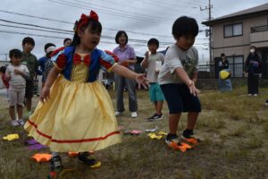 遊びの中では、英語の挨拶や簡単な単語を使いながら、モンスターの足跡をたどって進むモンスターの的当てに挑戦しました。