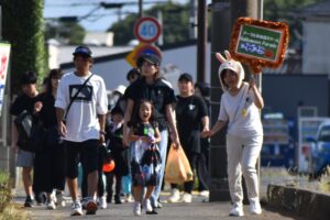 「アーブル英会話スクール Halloween Parade」のプラカードを先頭に、地域を元気よくパレードをしました。